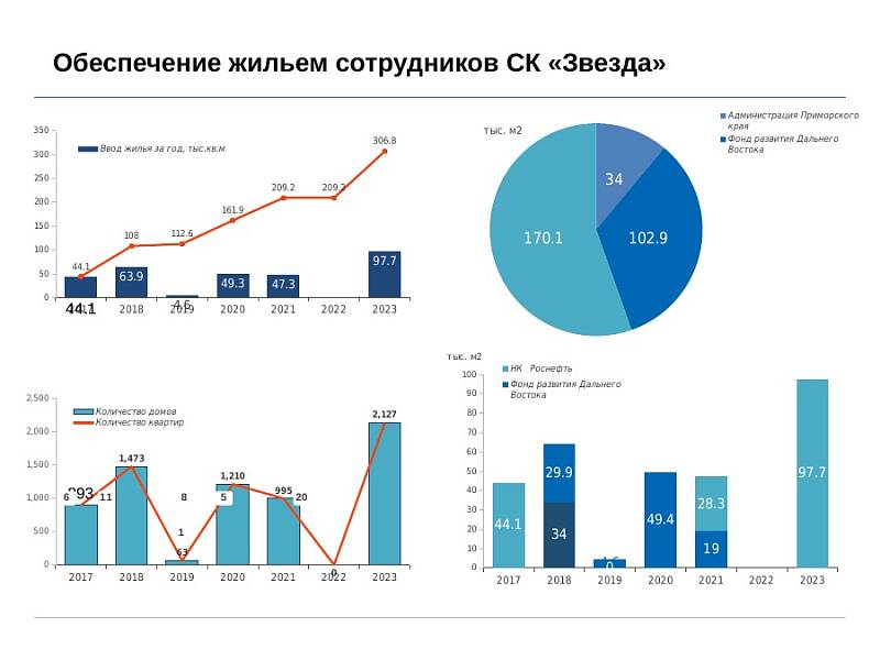 На сегодняшний день потребность в жилье для СК «Звезда» составляет 306,8 тыс кв метров. В долевом участии поручились: «Роснефть» — 164,8 тыс кв метров; Фонд развития Дальнего Востока — 108 тыс кв метров; региональный бюджет Приморского края профинансирует строительство — 34 тыс кв метров. О предполагаемой стоимости жилья информации нет.