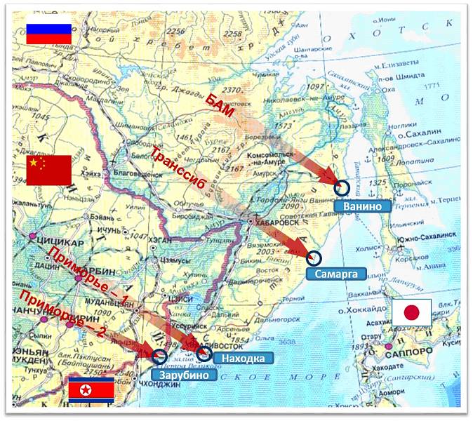 Если на преобладающей части магистрали основная ее задача — обеспечить транспортную доступность ресурсов и промышленных центров, то от Хабаровска — кратчайший выход к морским портам. Но когда нужен кратчайший выход к побережью — зачем ехать вдоль этого побережья более 500 км (для сведения, средняя дальность железнодорожной перевозки в Германии — около 300 км)? Целесообразность изменения конфигурации транспортного коридора Транссиб и создания альтернативы 900-км пути от Хабаровска на Владивосток и Находку в виде менее протяженного (около 400 км) выхода к Тихому океану должна составить один из приоритетов национальной транспортной политики.