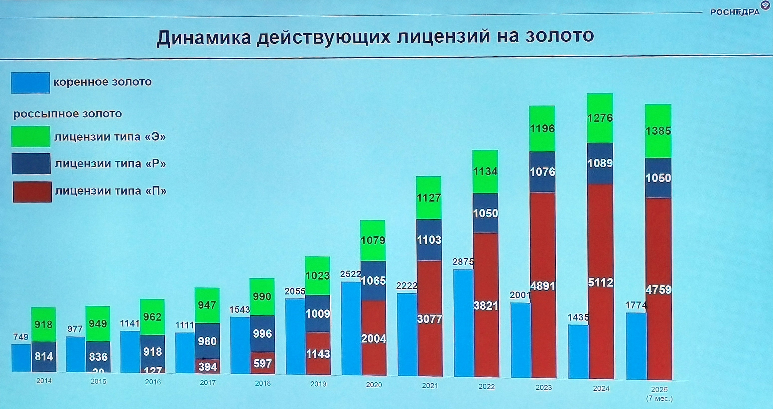 Он привел актуальные данные по динамике выданных лицензий. Их прирост в основном шел с 2016 года за счет поисковых «П»-лицензий, активно выдаваемых по заявительному принципу. Бурный рост их выдачи мог бы иллюстрировать успешность отрасли, но есть и другая сторона — в россыпную добычу пришло много недобросовестных недропользователей. Глава Роснедр оценил их количество в примерно 20% от общего числа золотодобытчиков, занимающихся россыпями.