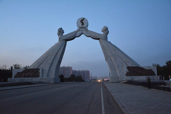 На обратном пути нас застал закат, но мы успели сфотографировать Арку воссоединения (двух Корей) на въезде в Пхеньян.