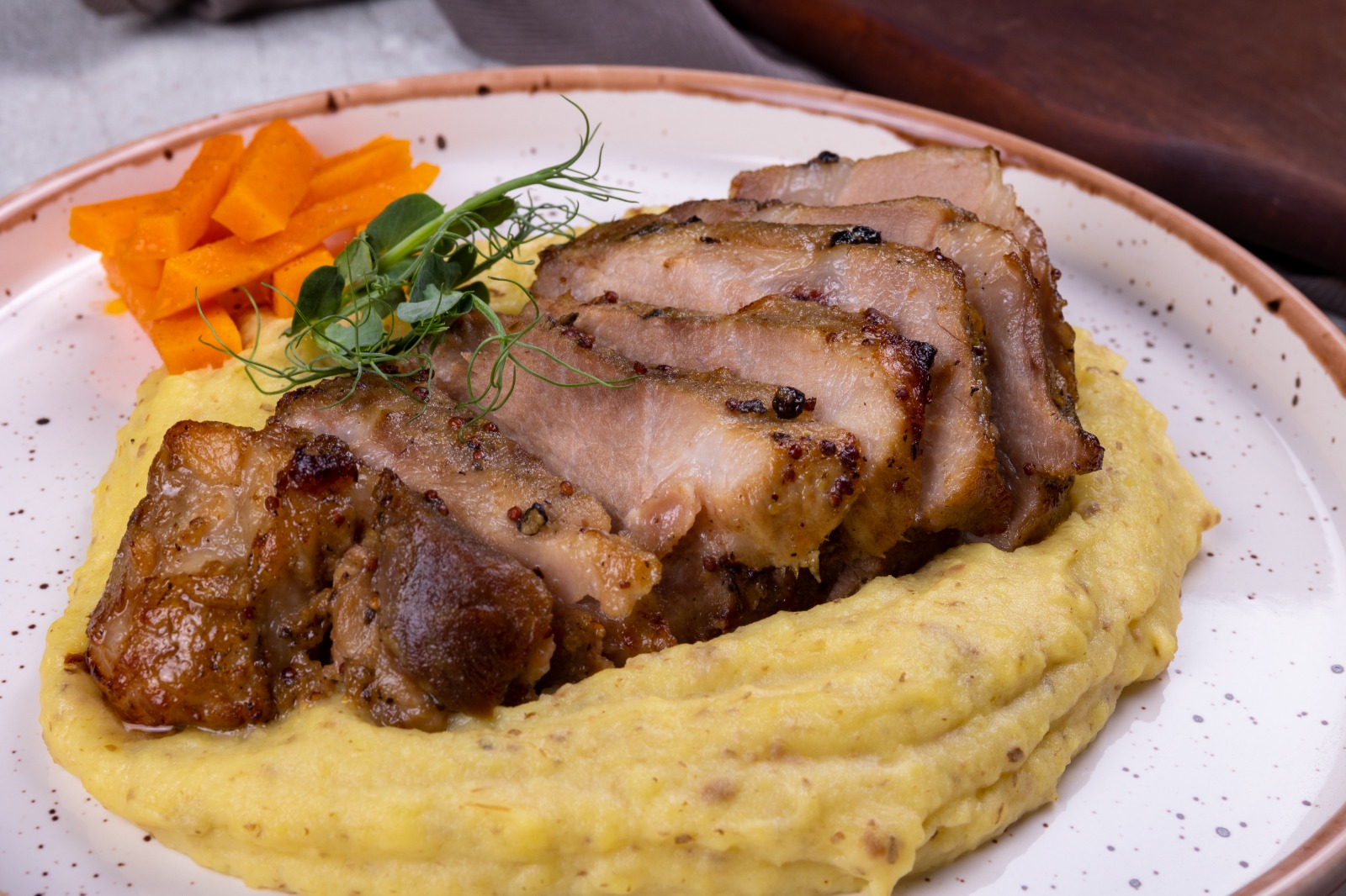 Буженина из свиной шеи томленая с травами, с трюфельном пюре и морковью по-корейски су-вид
