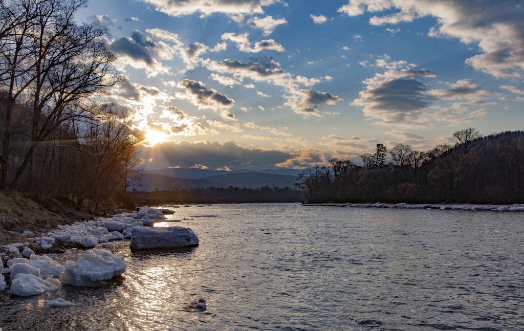 Стоя на берегу и вооружившись фотоаппаратами, мы наблюдали, как вместе со льдом вода в реке поднималась буквально на глазах! Огромные глыбы льда выдавливало на берег. Они останутся здесь, пока плюсовые температуры не одержат над ними верх. Ледоход продолжался до самого заката, и уже когда небо начало из красного становиться синим, он истощился до одиночных льдин. Уровень воды упал, оставив только забытые белые громадины по берегам.