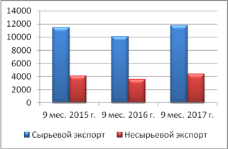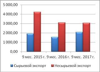 За 9 месяцев 2017 года из ДФО было вывезено продукции на сумму $16,2 млрд, что на 18,2% больше по сравнению с аналогичным периодом 2016 года. Сырьевой экспорт по стоимости превышал объем несырьевого экспорта почти втрое, при этом темпы роста несырьевого экспорта в 2017 году были несколько выше сырьевого – 22 и 16% соответственно.