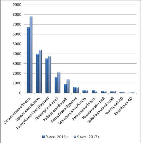 Наибольшие объемы экспорта были характерны для Сахалинской, Иркутской областей, Республики Саха (Якутия), Приморского и Хабаровского краев. Эти же регионы в течение рассматриваемого периода продемонстрировали положительную динамику экспорта. Сокращение экспорта в стоимостном выражении произошло в Амурской и Магаданской областях – на 20,6 и 3,9% соответственно.