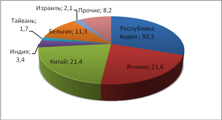 Несмотря на бытующее мнение о преимущественном вывозе товаров с Дальнего Востока в Китай, экспорт региона гораздо более диверсифицирован. Так, более 30% товаров из ДФО в течение 9 месяцев 2017 года было вывезено в Республику Корею, по 25,5% – в Японию и Китай. Вне АТР наиболее значимыми торговыми партнерами ДФО были Бельгия и Израиль.