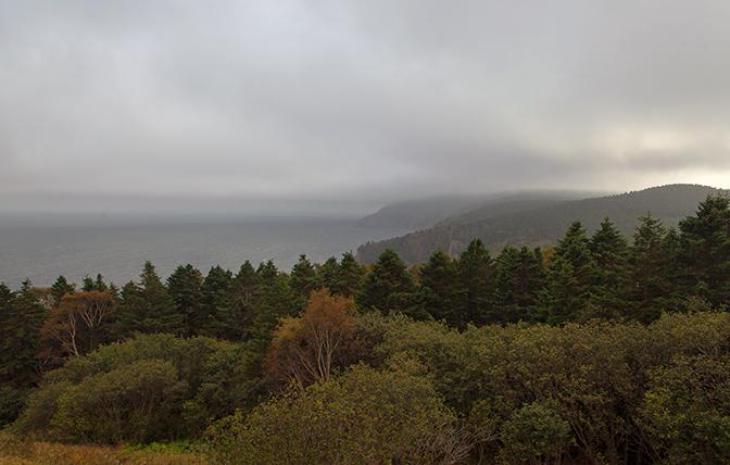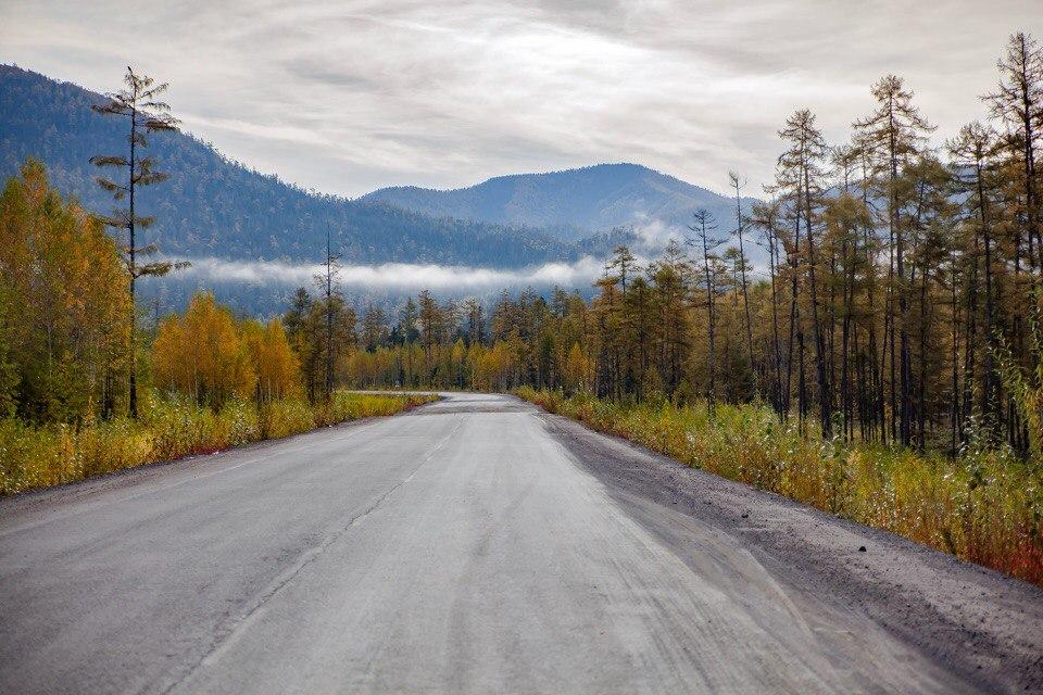 Рассвет застал нас у поселка Маяк, сначала едва заметно, а потом всё сильнее разгоралась нитка горизонта. Еще не выглянувшее солнце освещало одну тучу за другой, и вот уже все небо заиграло красками от темно-синего до лимонно-желтого. Традиционный завтрак в кафе у «Степаныча» и снова дорога. После Лидоги листва стала заметно ярче, разноцветнее. Оно и понятно, это уже север и горы. Золотая осень здесь вступила в свои права, и я ехал, не убирая фотоаппарат.