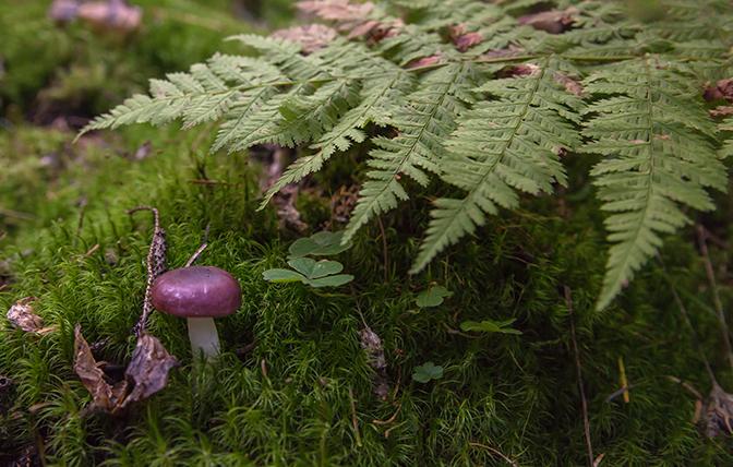 Немного набрав высоту по тропе, стал замечать все больше грибов, то тут, то там торчали шляпки сыроежек и опят. Да и сами мхи стали гуще, словно ковер, в котором утопают ноги. Совсем немногие травы могут через него пробиться. Кажется, что вот сейчас из-за елей, из густого мха выглянет леший.
