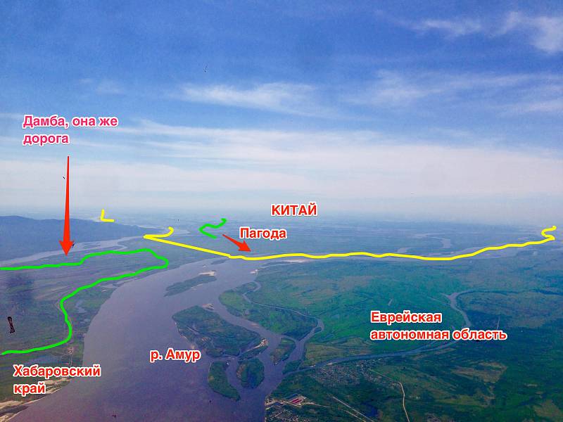 Граница между Россией и Китаем с самолета не просматривается. Яркой полосой видна китайская дорога, ведущая вдоль границы к пагоде. Видимо, она получше качеством, чем убитая гравийка по гребню дамбы с российской стороны. Эти две дороги между собой не соединены, погранперехода нет. Но он должен появиться – в этой точке он очень логичен.