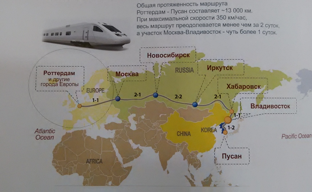 Проект, среди прочего, предполагает строительство — ни много ни мало — Евроазиатской высокоскоростной железной дороги «Единая Евразия» протяженностью 13 000 км от южно-корейского города Пусана — через Владивосток — до голландского города Роттердама, с максимальной скоростью движения по ней 350 км в час. При такой скорости участок Москва-Владивосток преодолевается чуть более чем за сутки! А весь маршрут — менее чем за