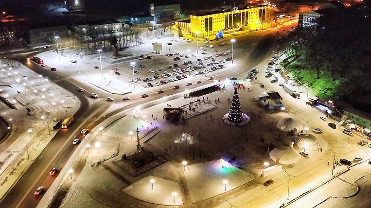 Кроме того, на центральной площади города открылся городок, на который ушло 1000 кубометров снега. Здесь появились три иглу, сделанные по скандинавской технологии, фигуры Деда Мороза и Снегурочки, светящиеся ёлочки и снеговики, зоны для сэлфи и праздничная ярмарка. Скульптуры выполнены по мотивам сказок Пушкина. Эскизы для них заказали в Хабаровске, снежной резьбой занимаются приезжие художники.