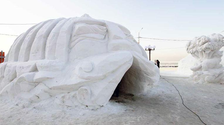 . Скульпторы создают из снега героев известных мультфильмов - Винни-Пуха, Чебурашку, Змея Горыныча и т.д.