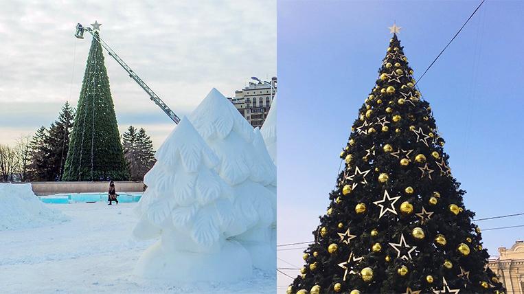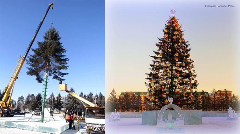 Установить ёлку на предназначенное ей место удалось со второй попытки, специалисты повторно опускали дерево и подрезали ствол бензопилой. Она встала криво, пришлось выравнивать с помощью веревок. После чего низ снабдили дополнительными ветками, и уже готовое дерево украсили игрушками и иллюминацией. Еловыми лапами украсили и столбы на площади. Здесь же местные мастера вырезают ледовые скульптуры и возводят новогодний городок.