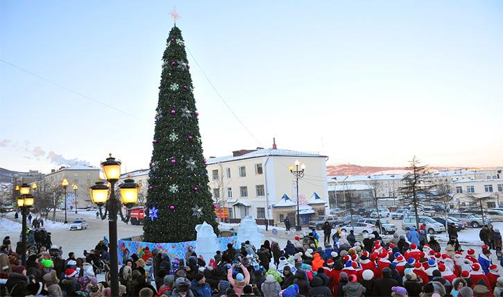 В столице Колымы – ёлка-ярмарка. 18-метровый символ Нового года установлен на главной площади города.