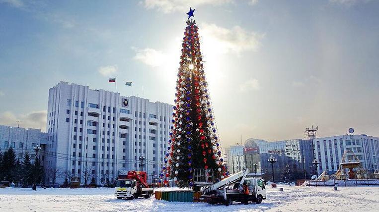 В амурской столице 20-метровую искусственную ель установили 15 декабря. На её монтаж ушло 2 дня. В этом году в ней заменили около 30% веток, пришедших в негодность.