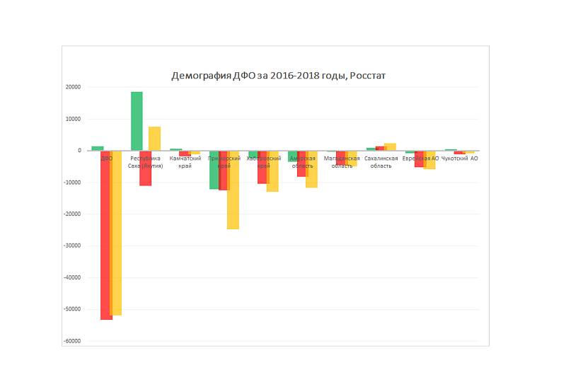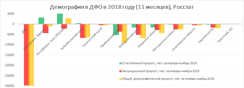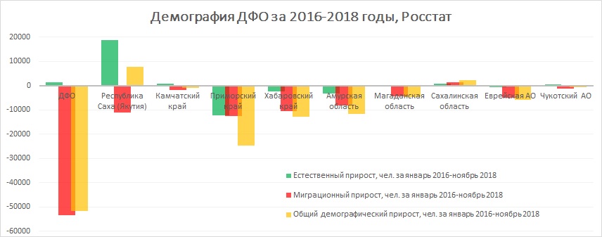 Всего же, как подсчитало EastRussia, за январь 2016 – ноябрь 2018 года ДФО в его прежних границах потерял более 51 тыс. человек постоянного населения. И это несмотря на героические усилия Якутии, обеспечившей за это время плюс 18,6 тыс. человек за счет естественного прироста, и успехи богатого Сахалина, где не только родилось людей больше, чем умерло, но и миграционное сальдо за три года вышло в плюс на 1,5 тыс. человек.
