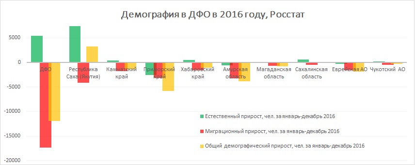 Так, в 2016 году ДФО сумел увеличить численность населения за счет превышения рождаемости над смертностью на 5,5 тыс. человек. Наибольший вклад смогла внести Якутия – там родилось на 7,3 тыс. человек больше, чем умерло. К сожалению, чистый миграционный отток в размере 17,1 тыс. человек превратил плюс в минус: общий отток населения составил 12 тыс. чел. 2016 год, напомним, стал первым годом активной реализации «новой экономической политики» на Дальнем Востоке: в строй были введены первые предприятия, и жителям Дальнего Востока пообещали триллионы будущих инвестиций.
