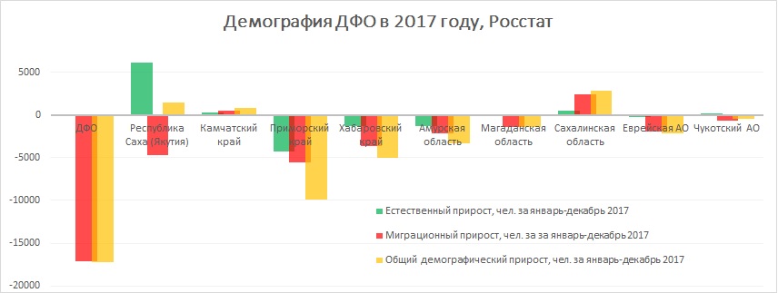 В 2017-м, казалось, бы, все должно было постепенно начать стабилизироваться. Но не тут-то было: в ДФО испортилась картина с естественным движением населения (вместо прироста получилось небольшое падение), а миграционное сальдо по-прежнему превысило минус 17 тыс. человек. Как результат, чистые потери в населении федерального округа, отчитался Росстат, также превысили 17 тыс. человек.