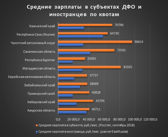 В Приамурье, например, по данным Росстата, всего 10,1 тыс. безработных, а иностранных рабочих по квотам, напомним, привлекается 28,7 тыс. В Хабаровском крае, которому требуется 8,3 тыс. рабочих-иностранцев по квотам, - 6,9 тыс. безработных. В Приморье, где на сентябрь 2018 года было 10,5 тыс. безработных, работодатели планируют занять иностранцами в 2019 году 7,8 тыс. рабочих мест.