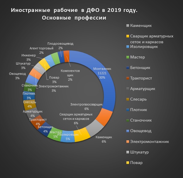 Вполне логичным, учитывая столь большую заявку на квоты от строителей в Амурской области, является распределение рабочих по специальностям: 30% от требуемых работников из-за рубежа – это монтажники, а топ-20 основных профессий рабочих по квотам наполовину сформирован строительными специальностями.