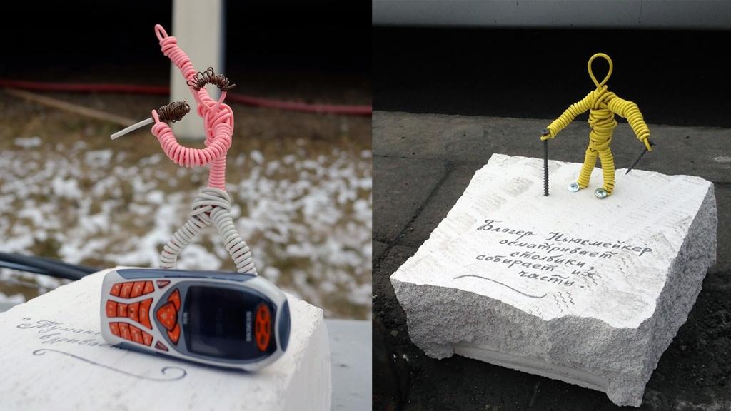 В общем, в день «Ч» появились памятники. Утром я их выставил на определённых местах, собрал жителей, карты раздал, взял мегафон и провел экскурсию. Вот здесь у нас стоит Лариса Белоброва после спектакля, вот здесь Павел Компан несет цветы маме. Они стояли в красивых местах, но были маленькие-маленькие. Это были плетенные из проволоки человечки, размером сантиметров по десять. Бюджет проекта составил 3000 рублей. Накануне позвонила наша баскетбольная команда «Приморочка» и сказала: слушайте, вы там памятники всем ставите, мы тоже хотим! А у меня как раз Илья Лагутенко отвалился, сказал, ни в коем случае, мы не разрешаем, и я говорю: хорошо, три тысячи рублей будет стоить памятник ваш. Они такие: «О! Три тысячи всего, без проблем, а мы–то думали». Но они тоже не знали, за что они платят на самом деле, и передали три тысячи. Это покрыло весь бюджет акции.