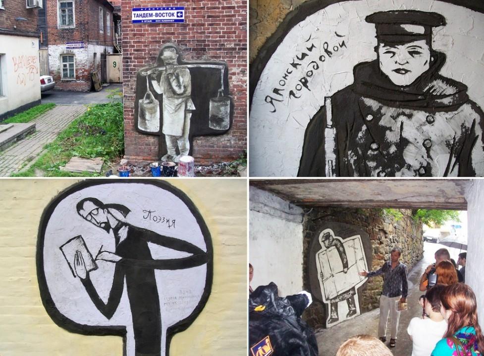 «Обитатели Миллионки» тоже знаковый для меня проект, 2010-й год, когда чиновники уже узнали меня, уже заказы были и деньги. Семь рельефов. Там смысл в том, что во Владивостоке есть исторический район под названием Миллионка, до нас не дошла еще джентрификация, потому у нас в центре города такие трущобы. Исторические здания не ремонтируются, они все текут, пахнут. Миллионка - потому что по легендам там был миллион китайцев. Эти дворы очень романтичны и красивы. И чтобы переманить жителей города с центральных улиц, где они обычно гуляют, и открыть им эту красоту я придумал проект типа квеста: расположить рельефы в разных закоулках. Например, есть китаец-водонос, там даже колодец рядом есть, исторический, ему лет 150. Был «Король Миллионки», но куда капитализм добирается, разрушается всё историческое, и в том числе эти рельефы сбивают один за другим.