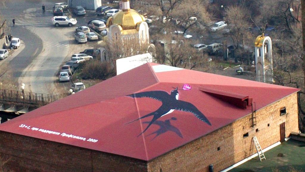 Я нарисовал ласточку с веточкой багульника на видовой точке на крыше фуникулера. Сделал это за свои деньги, чтобы показать и чиновникам, и горожанам, что теперь у нас будет городское искусство. Тогда были только граффити и серые стены, даже городской скульптуры не было. То есть были только произведения советского монументального искусства, а оно отличается тем, что имеет нравоучительный характер и взаимодействовать с ним ты можешь только с гвоздичками в определенный день - пришёл, постоял, минута молчания. А люди же путешествуют, видят, и они хотели те объекты, с которыми можно засэлфиться, пообниматься, потереть палец, и так далее.