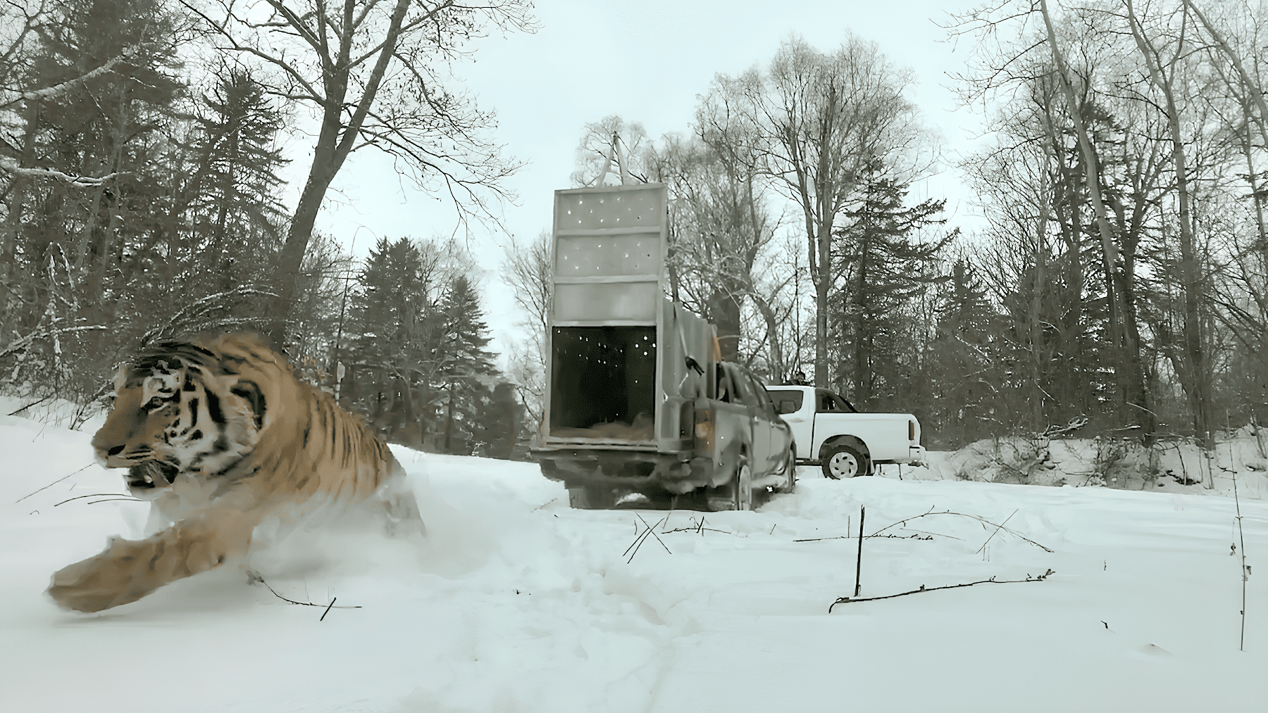 Выпуск тигра, отловленного в Надеждинском районе. Стоп-кадр видео. Источник: АНО «Амурский тигр»