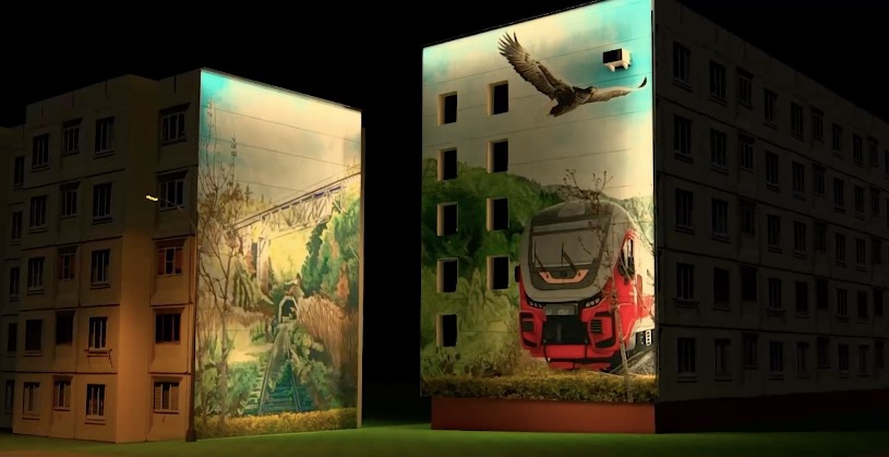 — В основном, с проектора. Вечером, когда стемнеет, напротив фасада ставится проектор и изображение с него выводится на дом. Масштаб эскиза, который ты сделал в планшете или на ноутбуке, увеличивается в размерах в десятки раз. Дальше художник работает на высоте: переносит картинку, делает полосы, линии. На следующий день рисуешь, опираясь на намётки, которые ты для себя сделал. Но проектор не всегда можно поставить. У меня было такое – мешало дерево. Тогда приходится делить фасад на мелкие квадратики и рисовать по схеме, но этот вариант более энергозатратный.