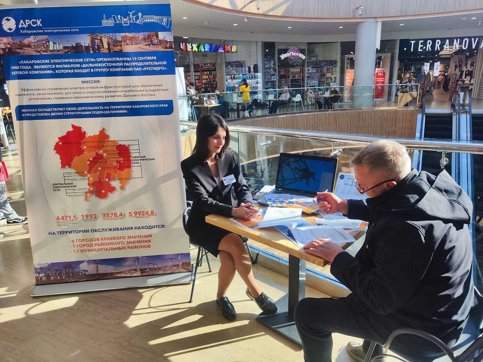 Хабаровские электрические сети (филиал АО ДРСК, входит в Группу РусГидро) приняли участие в ярмарке вакансий «Золотая осень», которую организовал центр занятости населения Хабаровска.