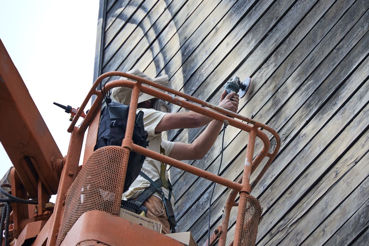 Фреска на дереве «рождается» не с помощью баллончика с аэрозольной краской, а при помощи болгарки и других инструментов. Краска в мурале не используется. За счет того, что нижние слои дерева светлее, чем верхние, художник вырезает изображения, прорабатывая светлые участки, в то время как темные остаются нетронутыми.