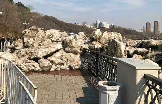 Ледовая масса сломала ограждение на набережной Амура в Хабаровске. Инцидент произошел днем в четверг прямо под утесом.