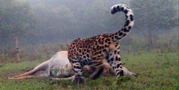 Как рассказали EastRussia в ФГБУ «Земля леопарда», на фотографии леопард запечатлен с добычей. Ученые установили личность леопарда – это котенок самки под номером Leo 101F, сейчас ему около двух лет, специалисты опознали его по уникальному узору пятен на шкуре. Ему присвоили собственный номер – Leo 252M.
