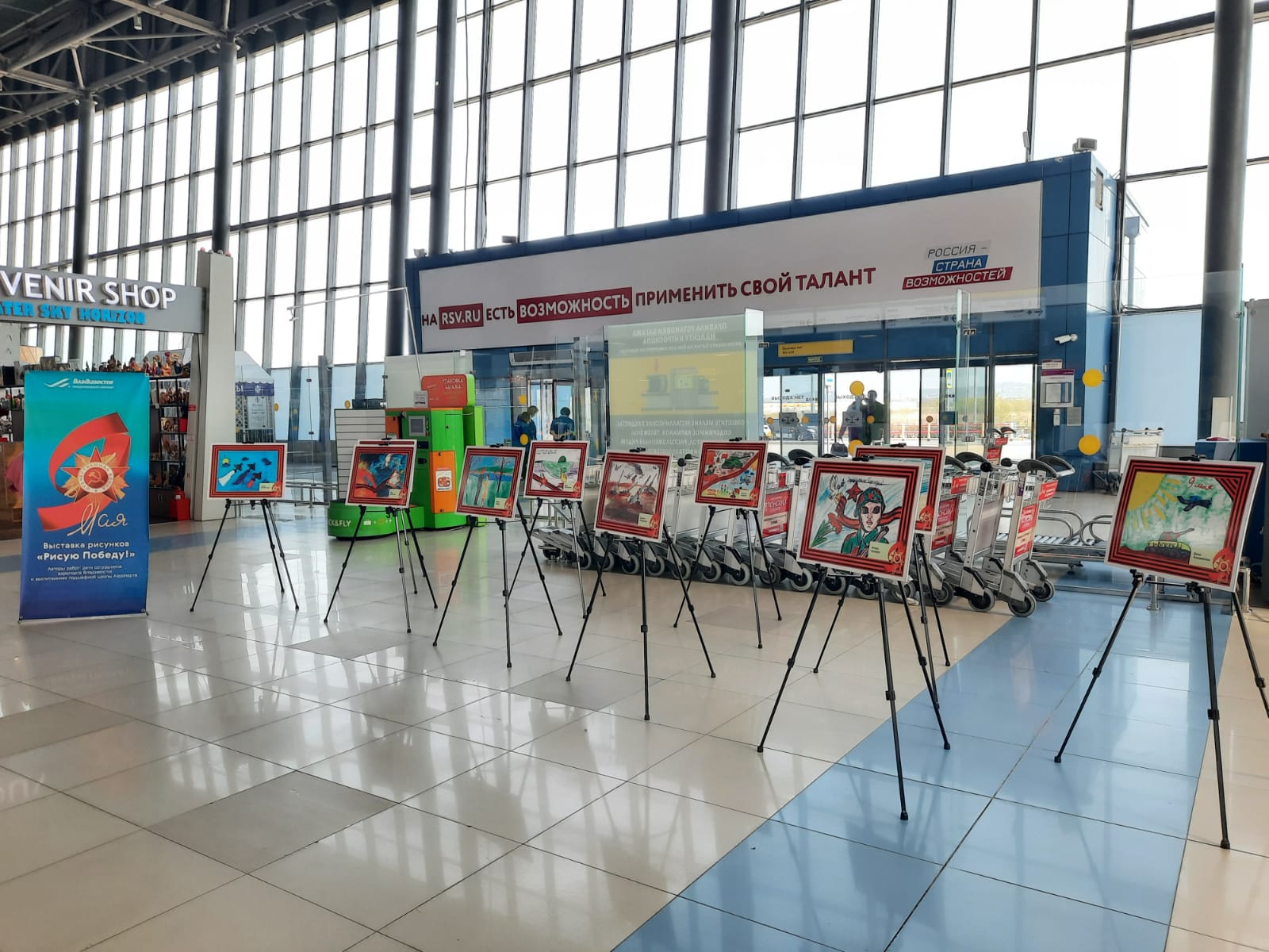 По доброй традиции аэропорт Владивосток провел конкурс детских рисунков на тему «Рисую Победу!» среди детей сотрудников предприятия и воспитанников подшефной школы. Участники конкурса передали слова благодарности всем тем, кто подарил нам мир через рисунок. В преддверии 9 Мая выставка детских рисунков, посвященная Великой Победе, украсила аэровокзальный комплекс воздушной гавани.