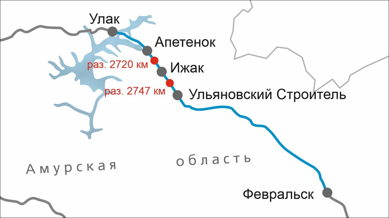 Первый разъезд построили на перегоне Апетенок-Ижак (его протяжённость составляет 2720 км), второй выполнен на перегоне Ижак-Ульяновский Строитель (его длина 2747 км).