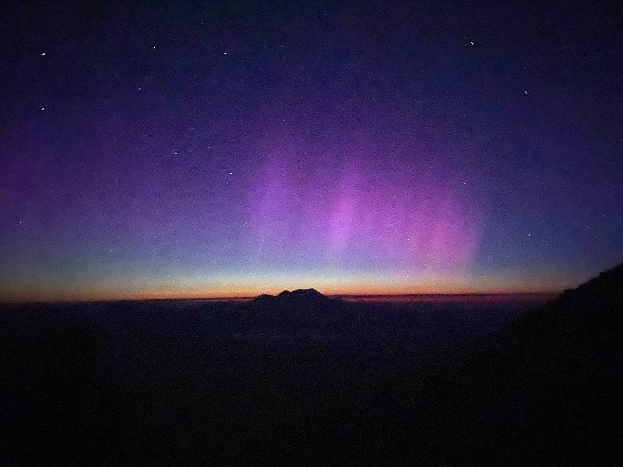 Группа путешественников встречала рассвет на Авачинском вулкане на Камчатке и увидела северное сияние. По мнению ученых, это стало возможным благодаря периоду магнитных бурь и повышенной геомагнитной активности, который пришелся в ночь с 4 на 5 августа.