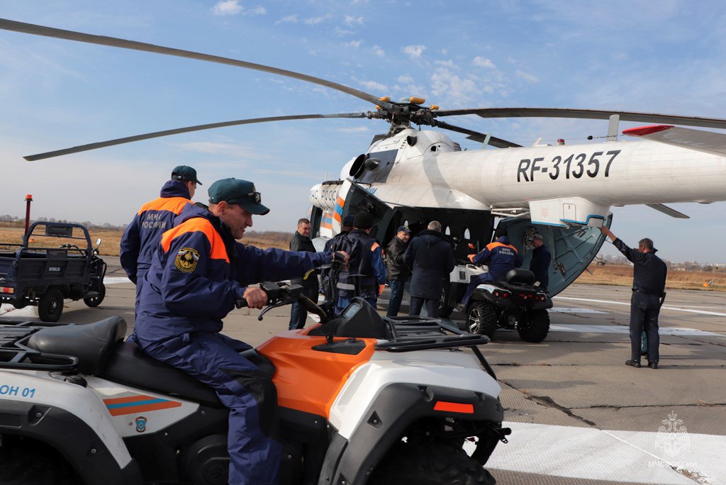 Две группировки спасателей (в каждой по четыре человека) доставили вертолетом на острова Хабаровска. Пожарные и спасатели взяли с собой необходимое снаряжение для борьбы с загоранием сухой растительности: шанцевый инструмент, квадроциклы, ранцевые огнетушители.