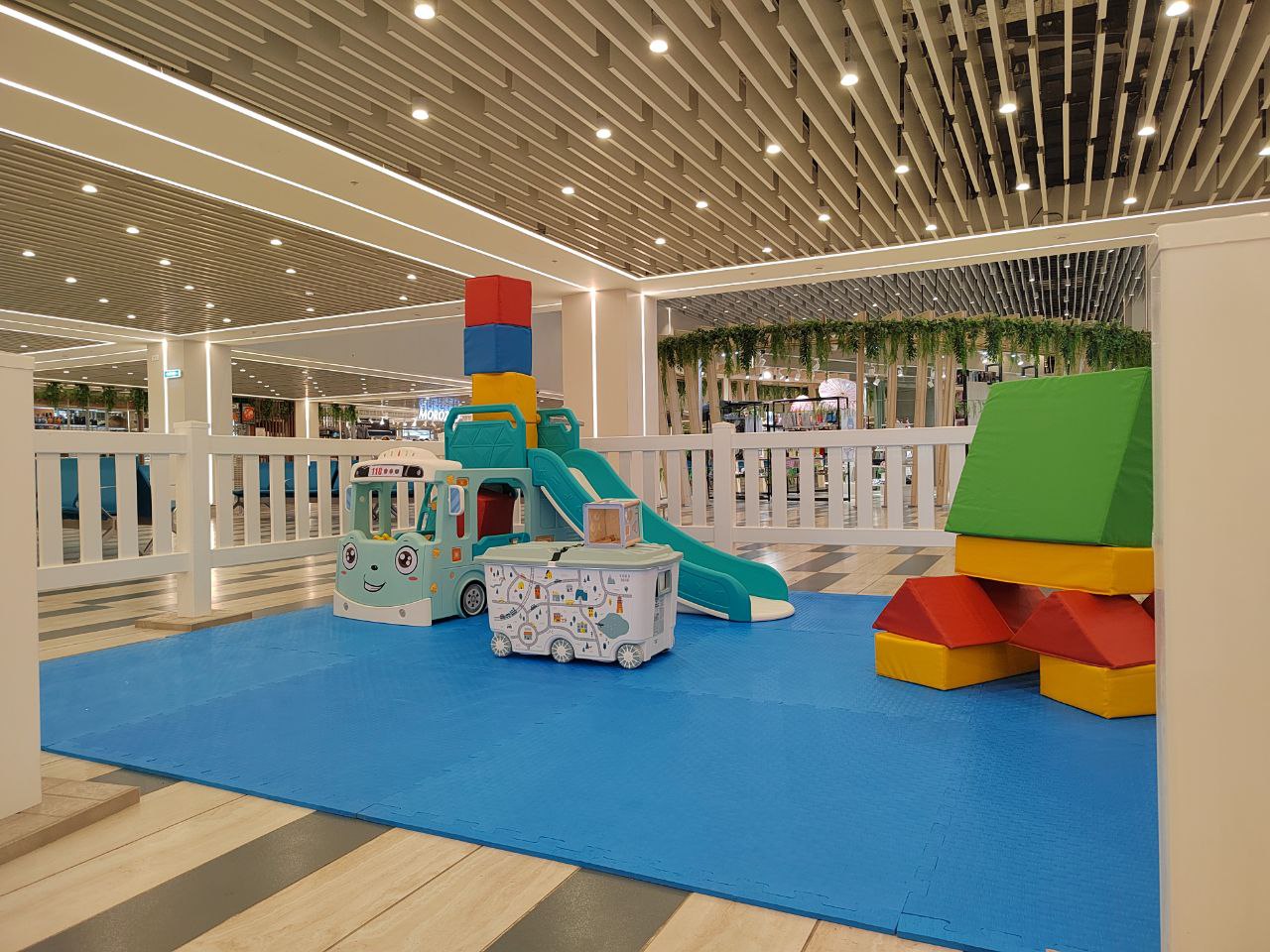 Отмечается, что рядом с игровой расположена уборная, где есть пеленальный столик и заниженные раковины с санузлом для детей.