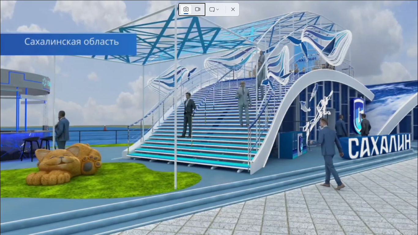 Гостей павильона Сахалинской области ознакомят с технологией сжижения природного газа в рамках выставки «Улица Дальнего Востока». Основной павильон региона будет выполнен в виде волн с силуэтами китов. Рядом расположится павильон инвестора в форме раковины морского гребешка. Центральное место экспозиции займет шестиметровый серый кит, а вокруг разместятся фигуры морских обитателей.