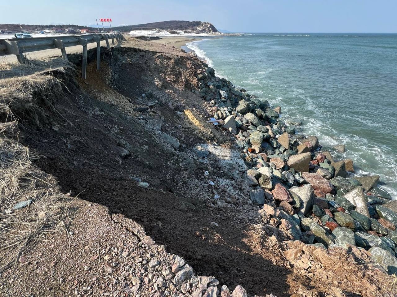 Участок региональной дороги размыло нагонной волной в заливе Мордвинова на Сахалине. Разрушение откоса насыпи земляного полотна произошло на 34 км автодороги Лиственничное – Охотское.