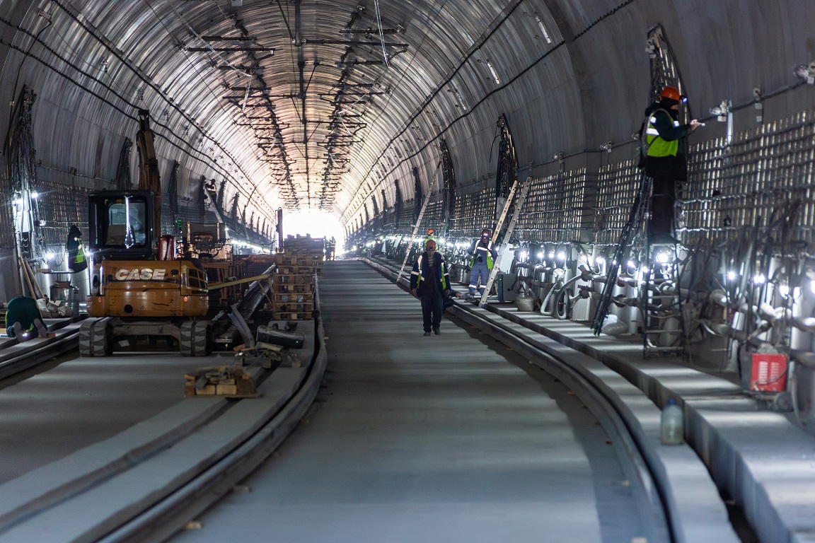 Параллельно с укладкой пути в тоннеле и на его подходах специалисты завершают монтаж контактной сети, систем СЦБ и связи, заканчивают строительство зданий и сооружений для эксплуатационного персонала.