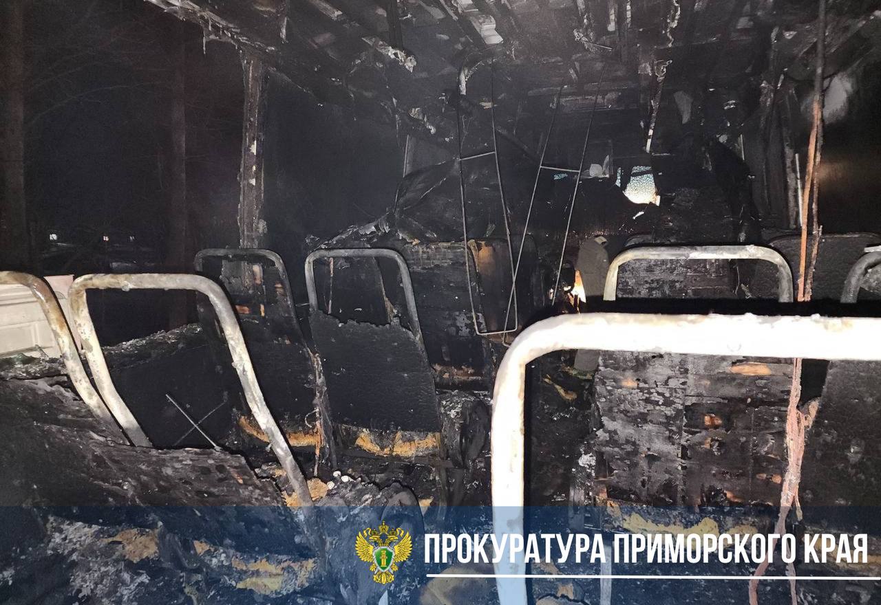 Пассажирский автобус по маршруту «Владивосток - Лесозаводск» полностью сгорел из-за неполадок в двигателе. В момент происшествия в салоне находились пять человек, никто не пострадал, прокуратура проводит проверку.