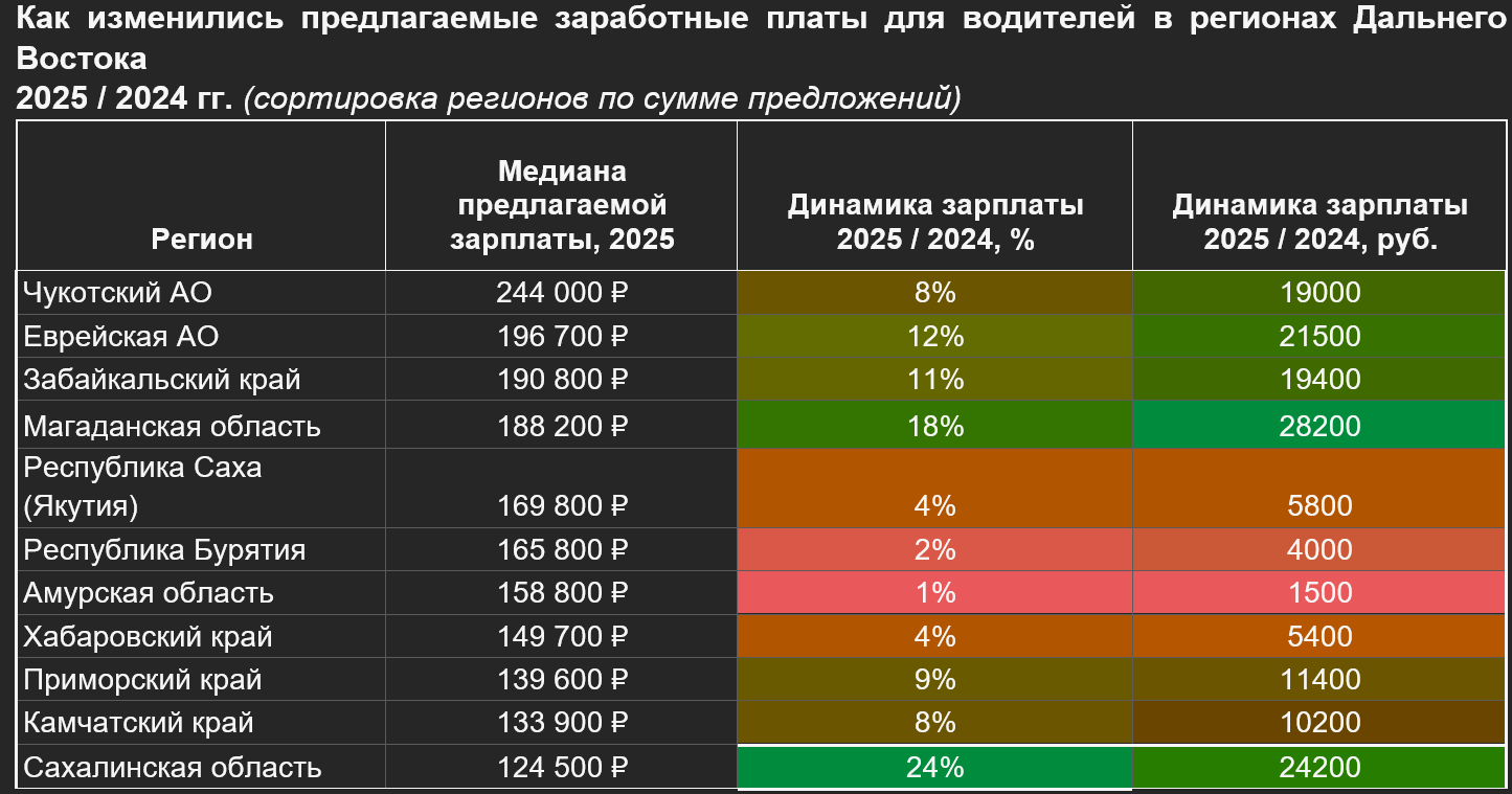 Самые высокие зарплаты работодатели предлагают водителям в Чукотском автономном округе (медиана — 244 тыс. руб.), Еврейской автономной области (196,7 тыс.) и Забайкальском крае (190,8 тыс.). Существенный рост оплаты зафиксирован в Сахалинской области (+24% за год), Магаданской области (+18%) и Еврейской АО (+12%).