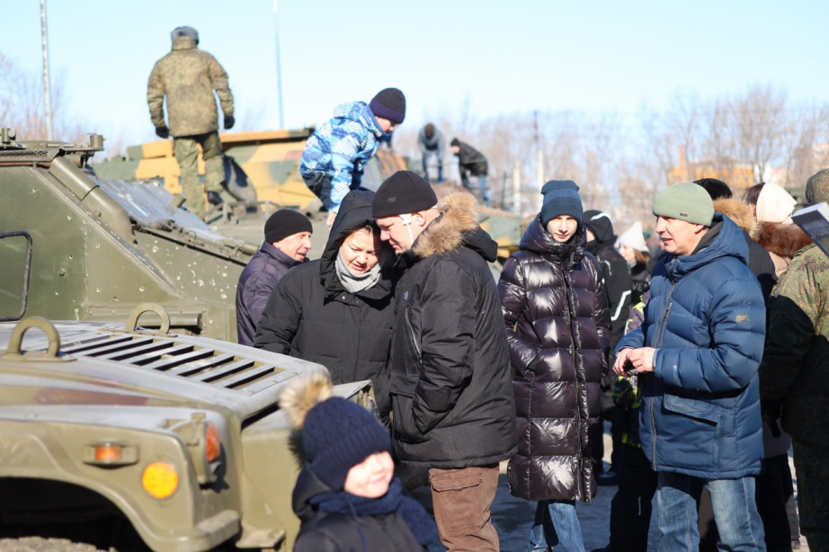 Гости мероприятия могли увидеть выставку военной техники Вооруженных Сил РФ. Каждый из представленных образцов применяется в зоне спецоперации. Это квадроциклы «Сокол», багги, танк Т-80, БМП и другие.
